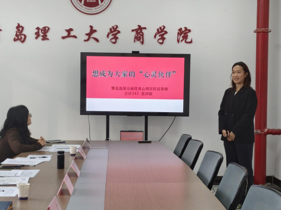 经过前期个人申请、初步筛选,学院共有6名心理宣传员进入院赛评选阶段。选手分别从个人简介、岗位认知、日常心理健康教育活动开展级工作实效等方面依次进行展示。经贸231班张传鹏结合校园生活实例,分享对学业压力、人际关系等常见心理困扰的观察与思考。财管242刘吉冉结合“情绪树洞”“解压手指操”等班级特色心理活动,分享日常心理健康教育工作实效。在评委提问环节,同学们从容应答,展现出扎实的专业素养与积极的服务态度。