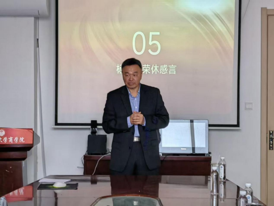 杨爱义教授回顾了在青岛理工大学度过的四十年峥嵘岁月,对学校、学院及同仁们的支持与关怀表达由衷感激。他动情地说:“能与一群热爱教育、志同道合的同事共同奋斗,是我一生的幸运。我虽荣休,心系学院,祝愿商学院蒸蒸日上,会计系薪火相传!”