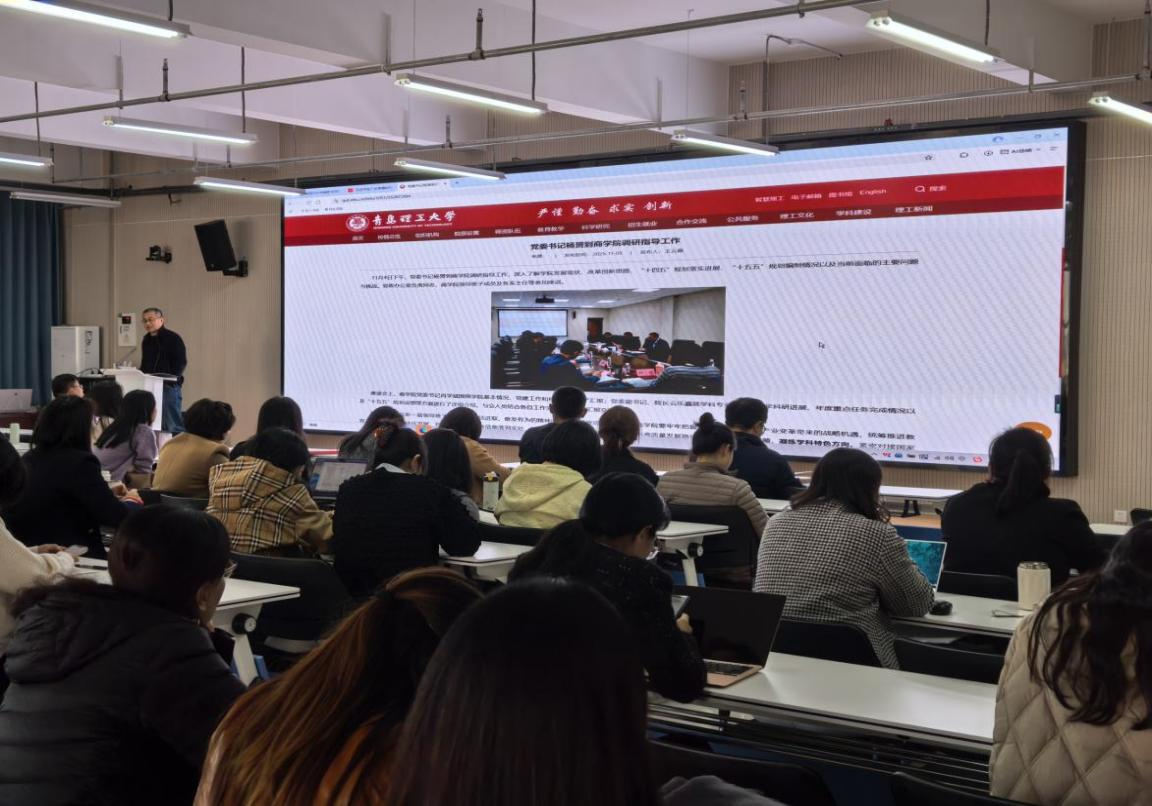 会议首先集体学习了党的二十届四中全会精神。云乐鑫简要总结了学院年度任务完成情况,重点肯定了在科研与人才队伍建设上取得的突破。他特别提到,朱晓鑫博士荣获山东省社科优秀成果奖,许瑶、徐晗筱、徐海涛三位博士成功入选山东省“青年泰山学者”,标志着学院在高层次人才建设上迈出关键一步。他强调,全体教师需沉心静气、精研打磨申报材料,变被动等待为主动谋划,力争在国家级项目申报实现新突破。此外,他还介绍了学院在科研数据库与案例库建设上的重大投入,并鼓励教师积极拓展横向课题与社会培训,实现科研成果与社会服务的有效转化。
