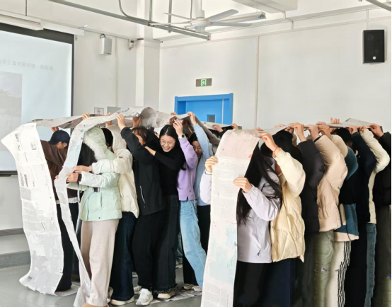 “无敌风火轮”团队竞赛将氛围推向高潮,各团队用报纸、胶带制作“风火轮”并完成接力比拼,过程中大家分工裁剪、默契配合,在攻克难题的成就感中显著提升团队协作与逆境应对能力。此外,吴玲还面向同学们分享各类心理咨询途径,引导同学们正确面对人生困境与情绪起伏,以积极乐观心态迎接未来挑战。“通过有趣的热身和团队游戏,让我在愉悦的氛围中释放了求职压力,感觉身心都轻装上阵了”,营销222班张凝郁分享道。