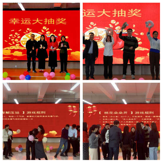 “游戏+抽奖”环节更是将欢乐值拉满!“桃花朵朵开”让大家在抱团互动中增进默契,“解压砰砰站”帮老师们释放压力、畅享轻松,欢呼声与笑声此起彼伏。抽奖环节惊喜不断,每一份礼品都承载着新年的美好祝愿,让现场暖意融融。活动尾声,全体教职工共同唱响《相亲相爱一家人》,温馨的旋律萦绕全场,为文艺汇演画上圆满句号。