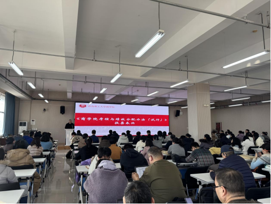 1月22日,商学院在学院401报告厅召开全体教职工大会,审议并通过《商学院考核与绩效分配实施办法(试行)》。学院领导班子及全体教职工参会,会议由商学院党委书记肖学斌主持。