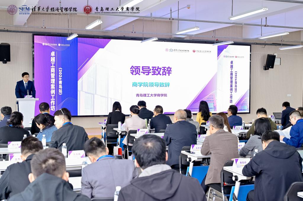 4月18日,由清华大学经济管理学院与青岛理工大学商学院联合主办的“卓越工商管理案例工作坊(2026青岛站)”在商学院401报告厅举行。来自清华大学、上海财经大学、哈尔滨工业大学等全国70所高校的110余名专家学者参会。商学院院长金炜博主持会议。